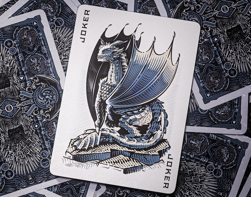 Au-delà des personnages, c’est tout l’univers de la série qui infuse le paquet. L’As de Pique, traditionnellement la carte la plus ornée, est un hommage direct aux différentes maisons, rehaussées d’un des dragons. Les Jokers sont eux aussi incarnés par des dragons, maîtres du ciel et du chaos. Mais la véritable immersion vient des détails qui parcourent chaque carte. Les dos, d’un noir rehaussé de reflets bleu et acier, sont un enchevêtrement de symboles : les 4 principales maisons, le logo de la série et le trône de fer dans toute sa splendeur. Chaque carte aurait pû porter des devises emblématiques comme « Winter Is Coming » ou « Valar Morghulis ». Tenir ce jeu en main, c’est comme tenir un artefact de la Citadelle, un objet qui a traversé les âges et les guerres de Westeros.