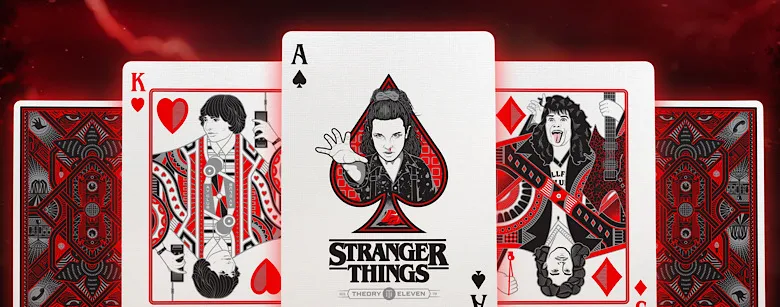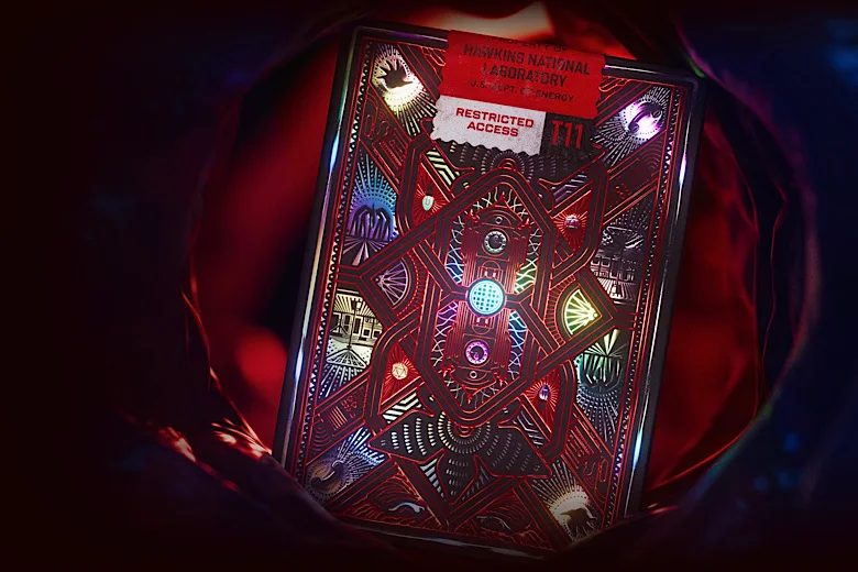 À l’intérieur de chaque paquet, Theory11 a méticuleusement recréé la galerie de personnages de la série. Les figures sont des hommages vibrants : Onze, le regard déterminé, en As de Pique ; le Shérif Hopper, protecteur et bourru, en Valet ; Dustin, Mike, Lucas et Will en Rois. Chaque carte est truffée de références cachées (les « easter eggs ») : la gaufre Eggo, le talkie-walkie, la batte cloutée de Steve, le chapeau de Dustin. Les As sont des lieux ou des symboles emblématiques, et les Jokers… les Jokers sont les horreurs de l’Upside Down. Les illustrations, avec leur style « dessiné à la main », renforcent cette impression d’artefact créé par les personnages eux-mêmes.