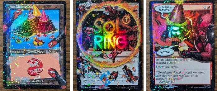 Avant de parler de ce nouveau set, il faut se souvenir que Deadpool n’arrive pas de nulle part dans Magic. En 2025, Wizards avait déjà sorti Secret Lair x Marvel’s Deadpool, un mini‑set de cinq cartes dans la gamme “Beyond” (Univers Infinis). 4 réimpressions connues (avec nouveaux artworks centrés sur le mercenaire à grande bouche) et une carte totalement inédite, Deadpool, Trading Card, mécaniquement unique, évidemment très méta.