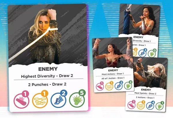 Chaque joueur incarne Wonder Woman et joue avec son propre mini deck composé de quatre types d’actions : bloc, lasso, sprint et punch. À chaque tour, on aligne des cartes contre un ennemi en jeu jusqu’à réunir la bonne combinaison d’actions pour le vaincre, puis on encaisse une récompense en fonction de sa contribution au combat.