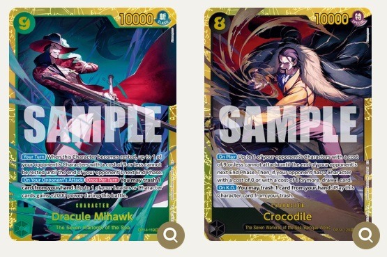 Rares et spectaculaires, les SEC offrent quelques-unes des illustrations les plus attendues du set, souvent autour de scènes iconiques ou de versions « ultimes » de certains personnages (Mihawk et Crocodile). Leur puissance et leur rareté en font des cartes très recherchées à la fois pour le jeu et la collection. - Cartes spéciales et parallèles (Special, Alt Art, Treasure Rare)